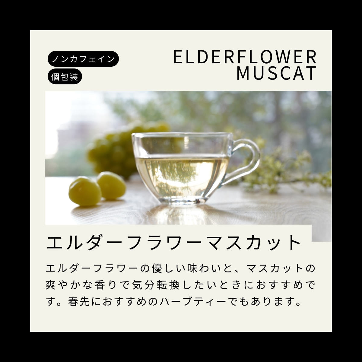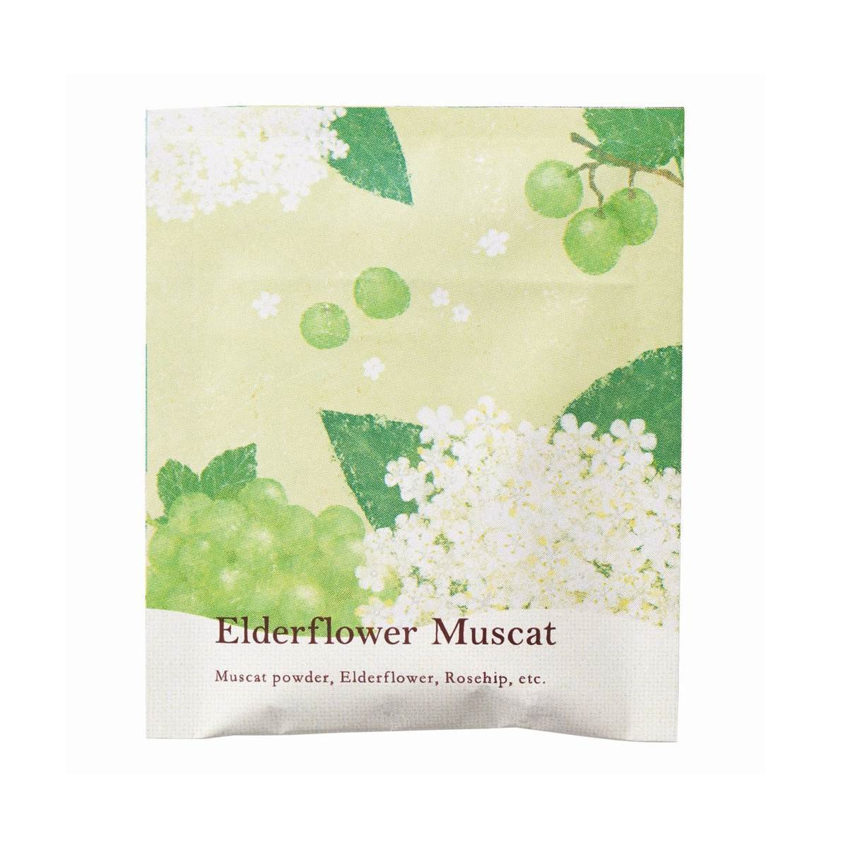ホワイトハイビスカス、ローズヒップ、エルダーフラワー、アップル、ステビア、マスカットパウダー/香料